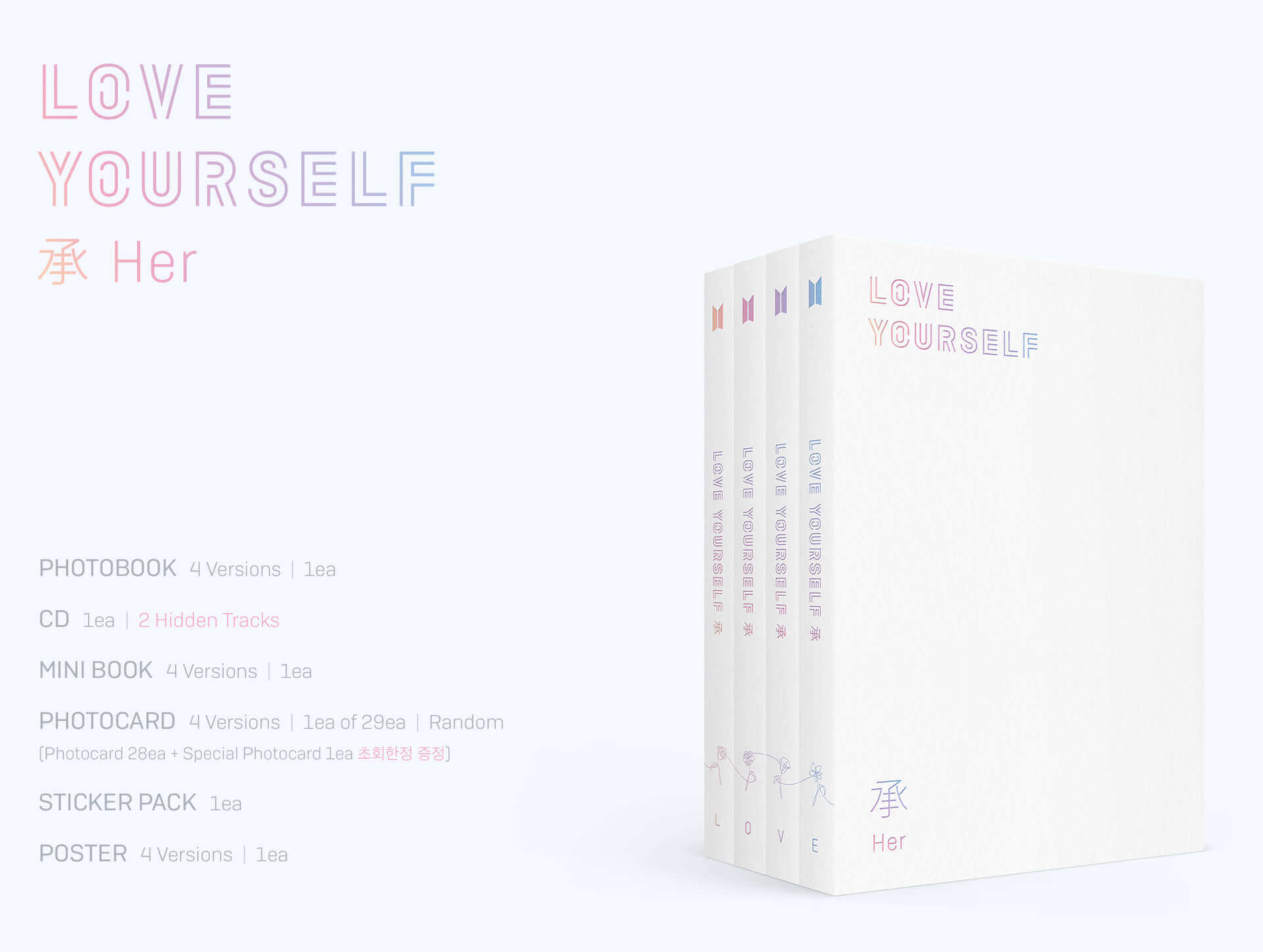 Love Yourself: Her (LOVE YOURSELF 承 ‘Her’) is the fifth extended play by BTS. The mini-album was released on September 18, 2017. DNA serves as the lead single. The album consists of nine tracks with two hidden tracks.